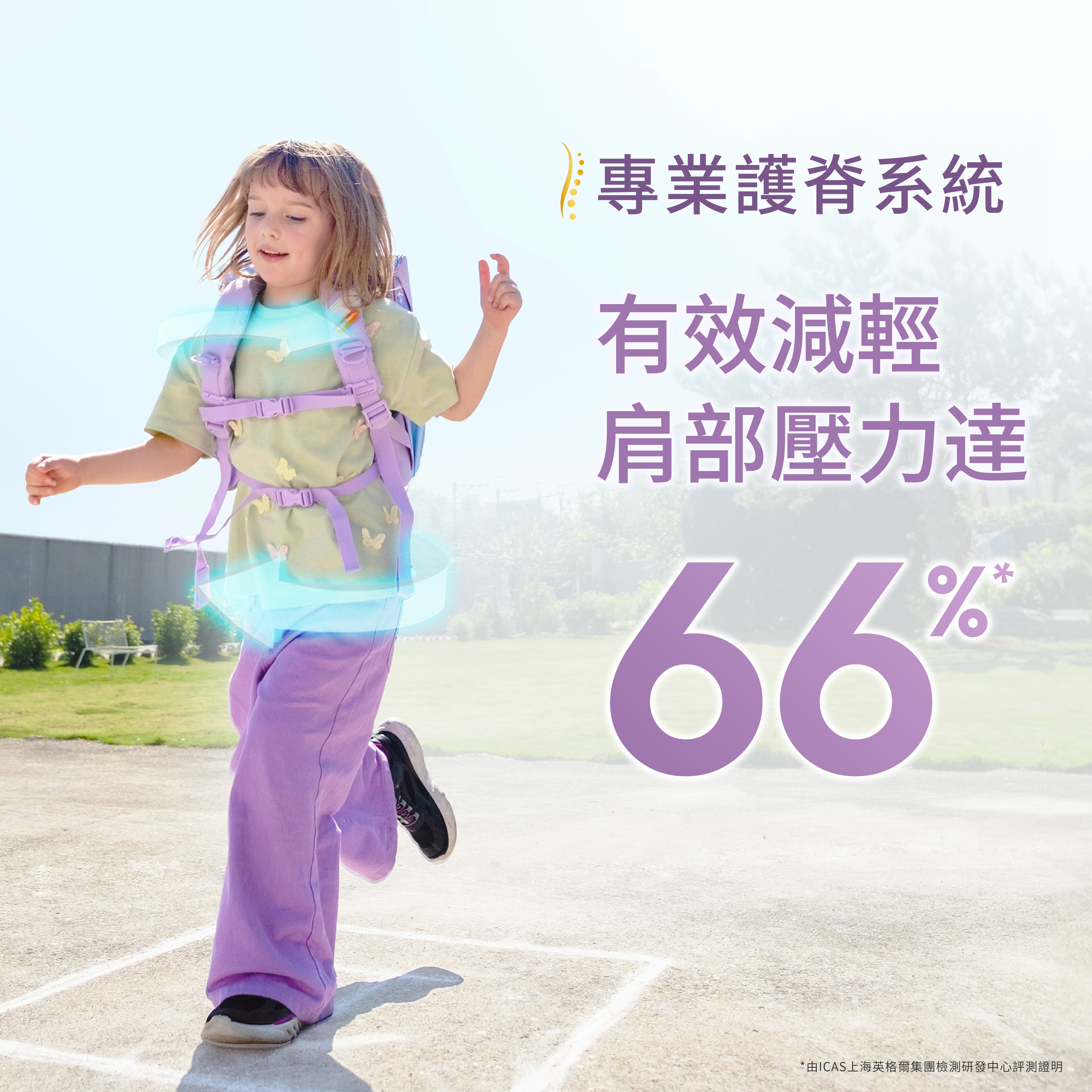 - 360人體工學護脊系統有效減輕肩部壓力達 66%,由 ICAS 上海英格爾集團檢測研發中心測評證明,3D網狀透氣加厚背墊上的獨特中空結構和肩部弧形曲線設計,配合胸扣和腰帶,有效緩衝書包重量負擔,支撐孩子脊柱,卸力舒壓,輔助維持良好體態