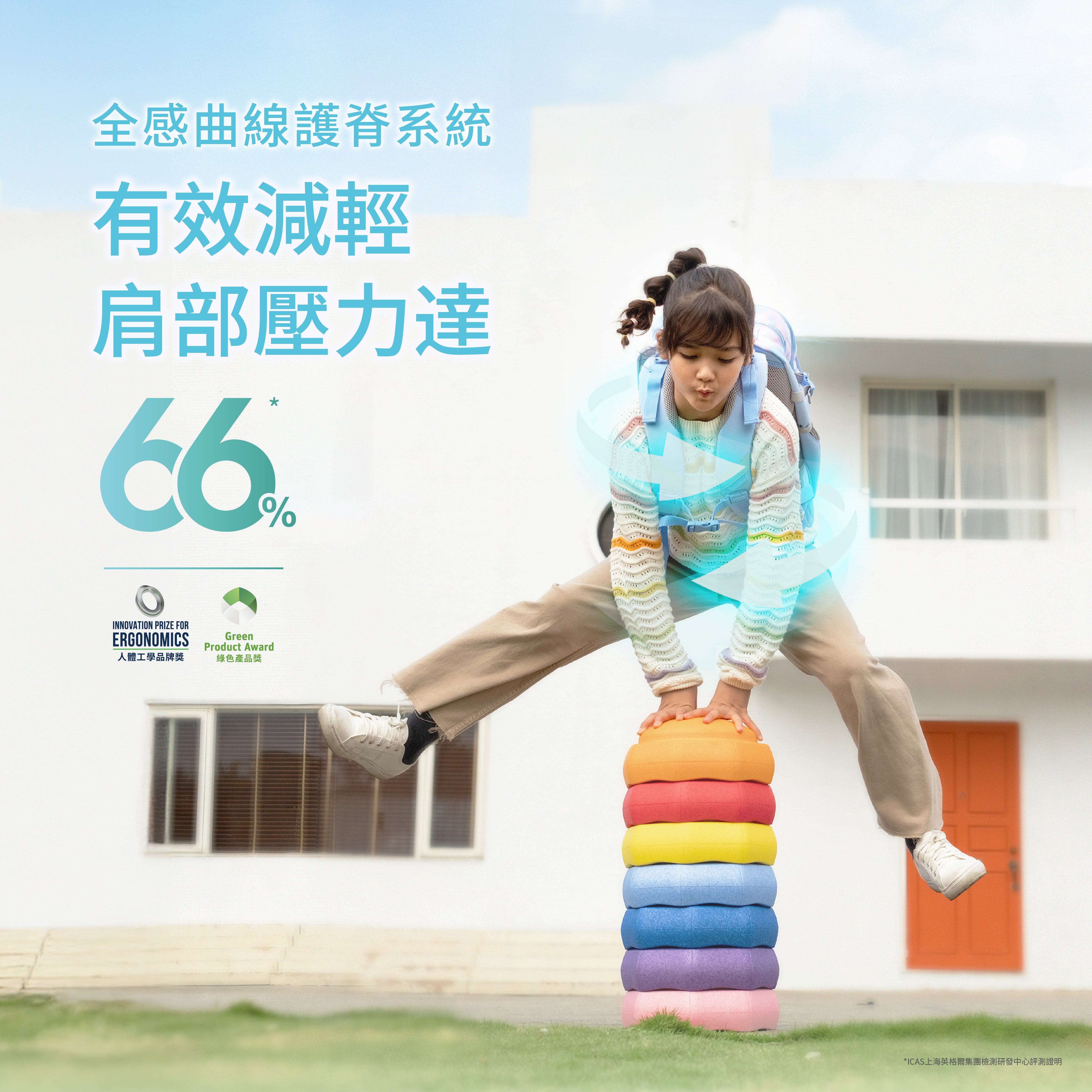 由ICAS上海英格爾集團檢測研發中心評測證明,書包採用的全感曲線護脊系統有效減輕肩部壓力達66%,3D網狀透氣加厚背墊上的獨特中空結構和肩部弧形曲線設計,配合胸扣和腰帶,有效緩衝書包重量負擔, 支撐孩子脊柱,卸力舒壓,輔助維持良好體態