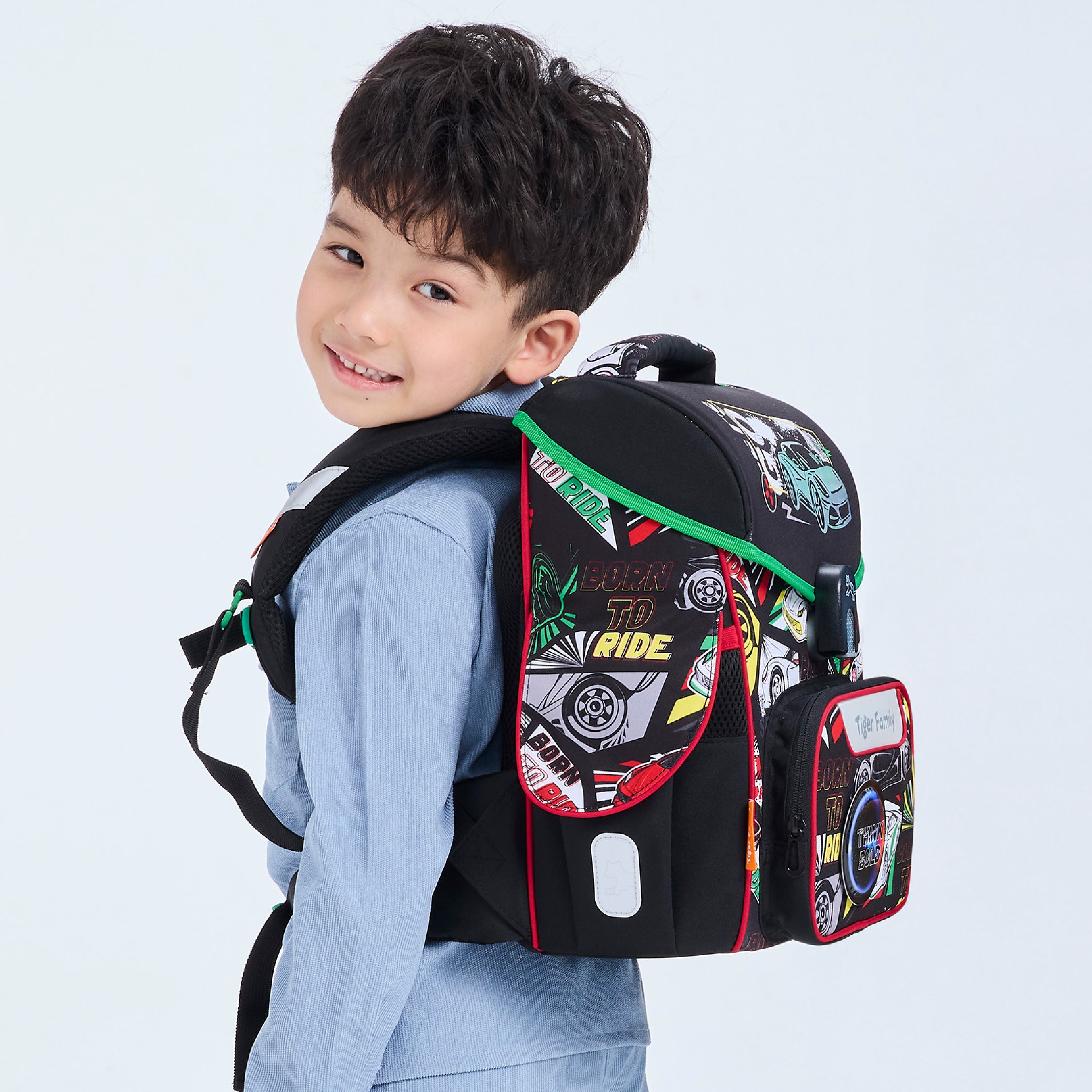 - 360° 安全反光物料可全方位保護孩子在傍晚或大霧天氣時況下,在路上行走的安全