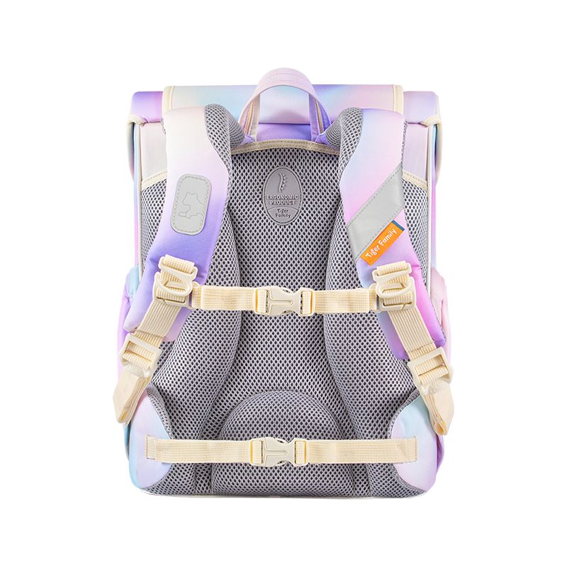 由ICAS上海英格爾集團檢測研發中心評測證明,書包採用的360人體工學護脊系統有效減輕肩部壓力達66%,3D網狀透氣加厚背墊上的獨特中空結構和肩部弧形曲線設計,配合胸扣和腰帶,有效緩衝書包重量負擔, 支撐孩子脊柱,卸力舒壓,輔助維持良好體態
