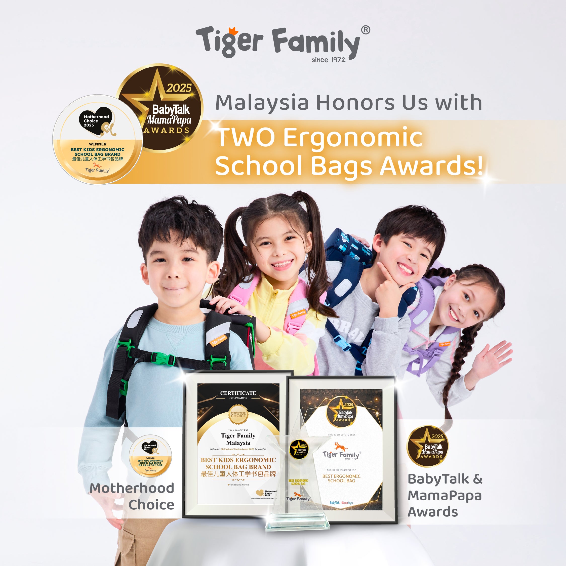 Tiger Family has once again reinforced its leadership in ergonomic school bags by winning two prestigious awards: BabyTalk & MamaPapa Awards for “Best Ergonomic School Bag” and Motherhood Choice Awards for “Best Kids Ergonomic School Bag Brand.” Both honors, voted by parents and endorsed by experts, highlight the brand’s excellence in safety, comfort, and innovative design. Tiger Family remains committed to protecting children’s spinal health and providing parents with a trusted choice.