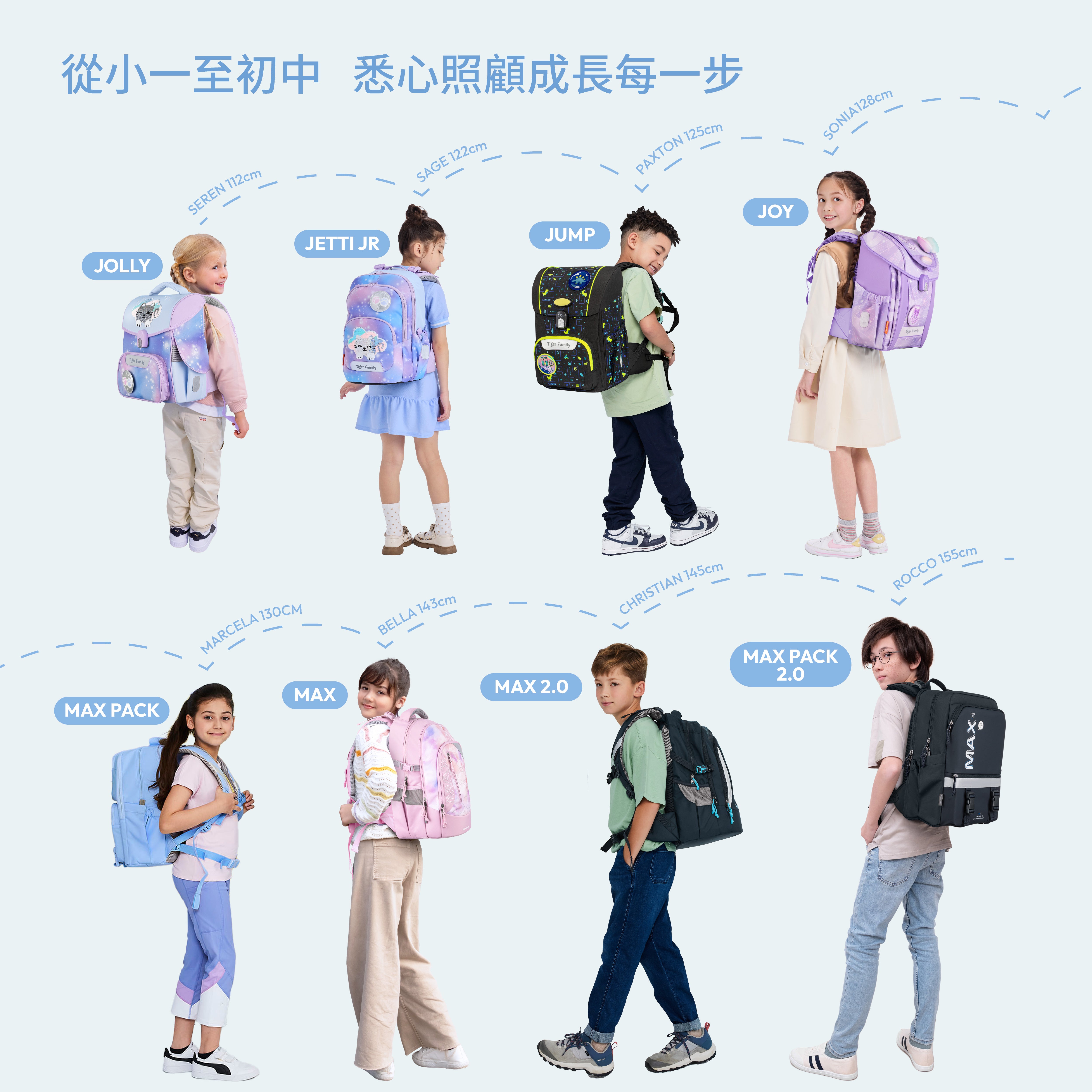 - 符合人體工學設計,獲得德國IGR e.V.人體工學品牌獎及人體工學產品認證,書包利用背墊系統令書包盡量貼合背部,透過9區域動態承托及5重鎖定去支撐孩子脊柱,加上書包使用上方便輕捷,背負透氣舒服,物料安心可靠,並配有高質工藝及美學設計,提升孩子身心的生活品質